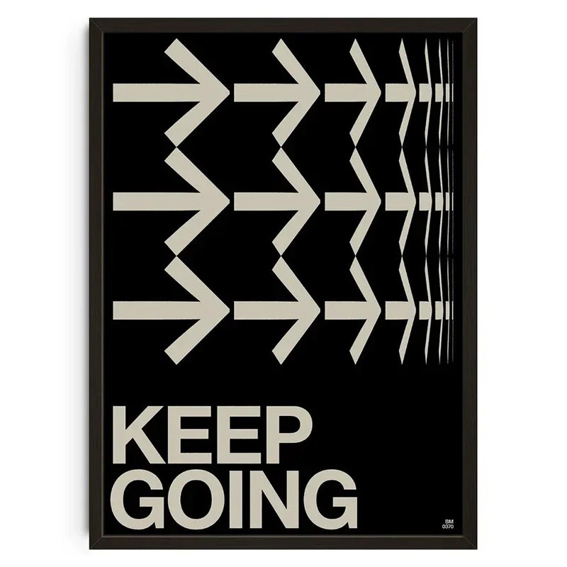 Poster minimalista con frecce e testo keep going su sfondo nero. Decorazione per parete stilosa con forte contrasto e design pulito. Descrizione completa