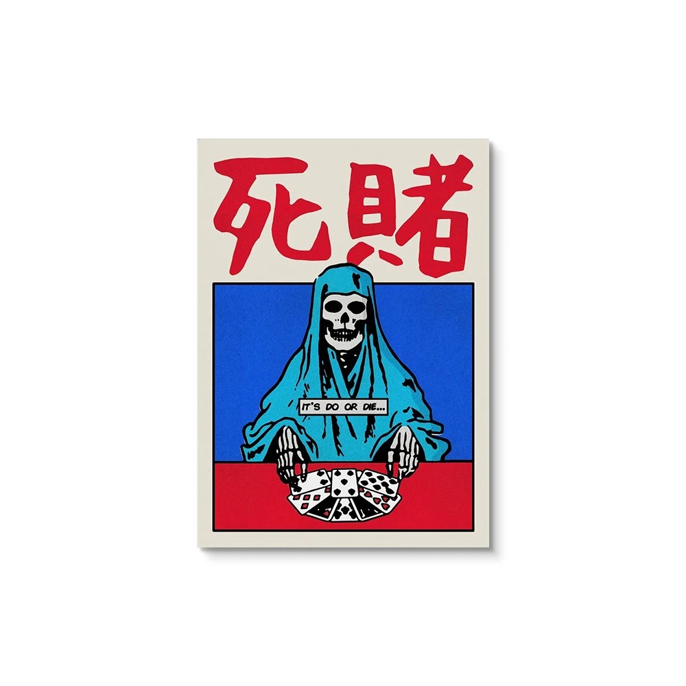 Poster audace e provocatorio che ritrae la figura della morte con le carte in mano offre un'esperienza visiva e filosofica profonda. Il contrasto tra il rosso, il blu e il nero, combinato con caratteri giapponesi e il testo „It's do or die“ crea un forte messaggio artistico. Questo poster non è solo una decorazione, ma anche un elemento di stile per interni moderni con un carattere distintivo. Ideale per gli amanti dell'arte alternativa, dello street art o per chi desidera portare nella propria spazio sfida e originalità. Stampato su tela senza cornice di dimensioni 40 × 60 cm, il che consente un facile adattamento a qualsiasi ambiente.