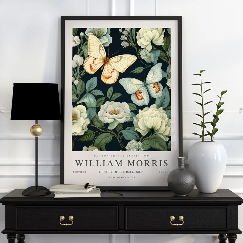 Poster artistico con fiori e farfalle nello stile di William Morris. Dimensione 50x70 cm, tela in poliestere adatta per decorazione d'interni. Descrizione completa