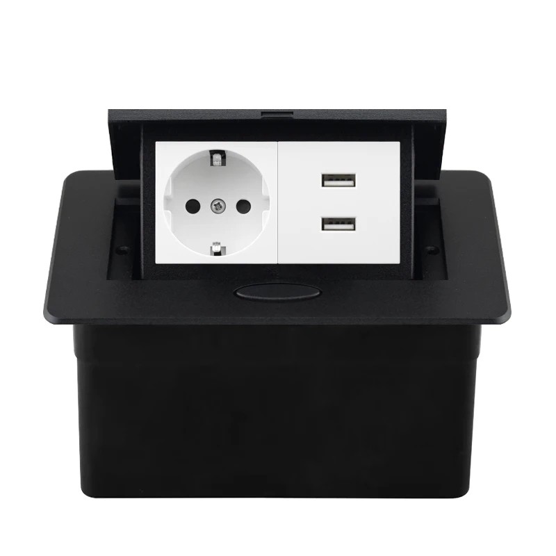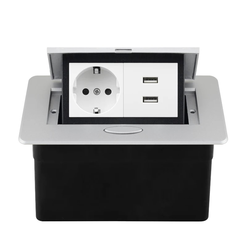 Questo tipo di presa aiuta a mantenere lo spazio di lavoro ordinato e privo di cavi superflui. Grazie al meccanismo a scomparsa, è accessibile solo quando necessario e altrimenti rimane nascosta nel piano. La combinazione di una presa tradizionale e porte USB ne aumenta la versatilità. La superficie in alluminio contribuisce alla robustezza della struttura e alla facile manutenzione. È adatta sia per ambienti domestici che per uffici.