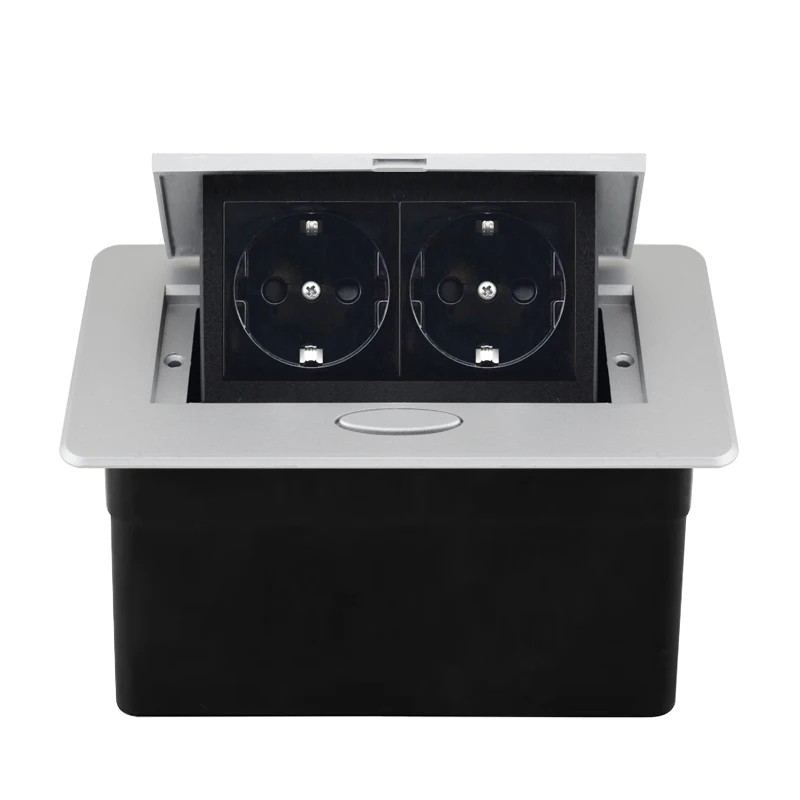 Il modello è dotato di 2× presa EU, che consente di collegare due dispositivi contemporaneamente. La costruzione è progettata per tensione 250 V e corrente 16 A, rendendola adatta per elettrodomestici comuni sia domestici che per ufficio. Il coperchio è realizzato in lega di alluminio, che garantisce resistenza e lunga durata. Le dimensioni della parte superiore sono 153 × 117 mm, mentre l'apertura di installazione è di 140 × 110 mm. La profondità della scatola raggiunge 70 mm, rendendola adatta per l'installazione in piani di lavoro standard.