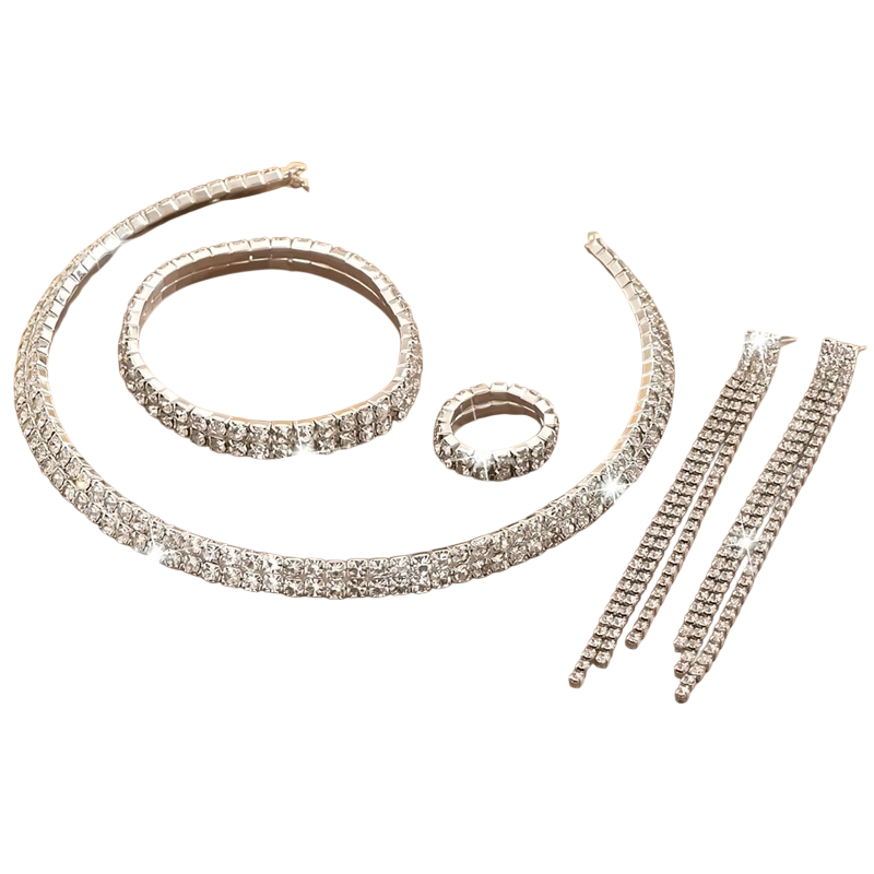 Il bracciale elastico si adatta comodamente al polso e garantisce comfort durante tutto il giorno e la sera. La collana con estensione consente di regolare individualmente la lunghezza in base al décolleté dell'abito. Gli orecchini pronunciati mettono in risalto il viso e l'anello completa elegantemente l'intero set. Questo design scintillante con pietre appare festoso e sofisticato. Se stai cercando un set di gioielli elegante e completo per un matrimonio o una festa, questo set è la scelta perfetta che esalterà la tua bellezza e ti darà fiducia in ogni evento significativo.