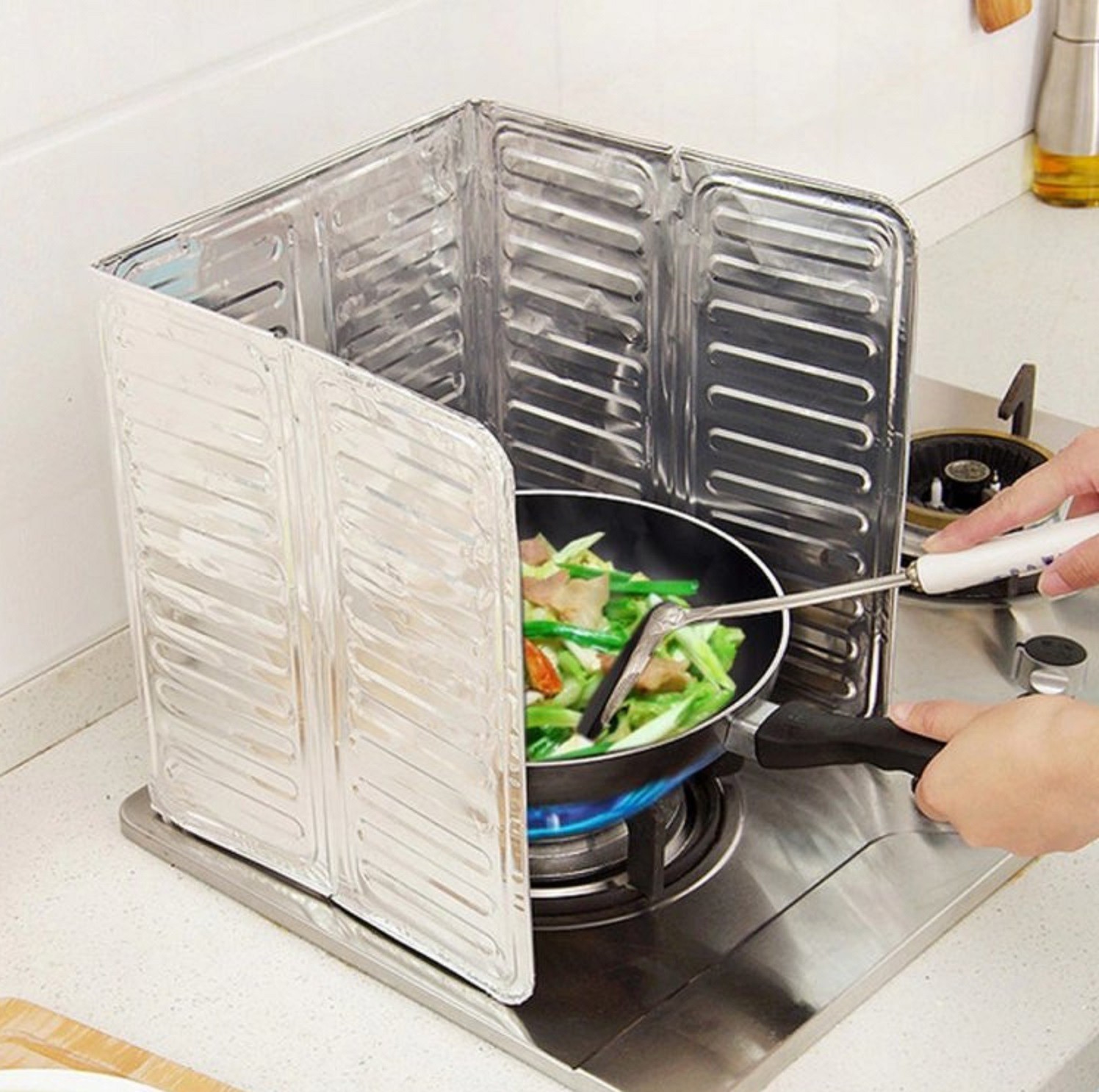 Questa pellicola in alluminio previene lo sporco sulla parete durante la cottura, la frittura o la grigliatura.