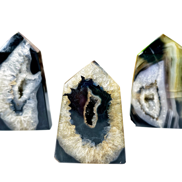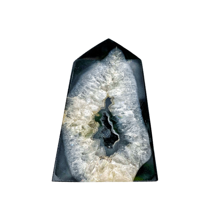 La punta è lavorata in forma geometrica, mantenendo le proprietà naturali del materiale. Il peso dei singoli pezzi varia tra 20–50 g, rendendoli un elemento decorativo di dimensioni ridotte, adatto per diverse posizioni. La superficie della pietra è parzialmente lucidata, evidenziando il suo disegno e la sua struttura.