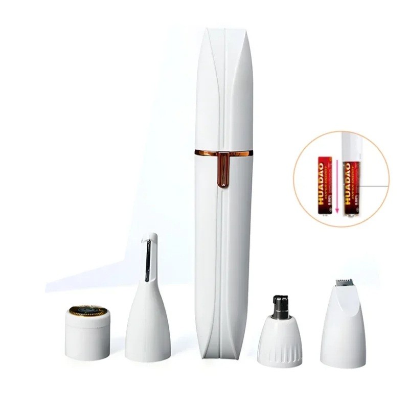 Rasoio elettrico universale con 4 testine intercambiabili per la cura di sopracciglia, naso, capelli e corpo. Facile da lavare, compatto, a batteria. Descrizione completa
