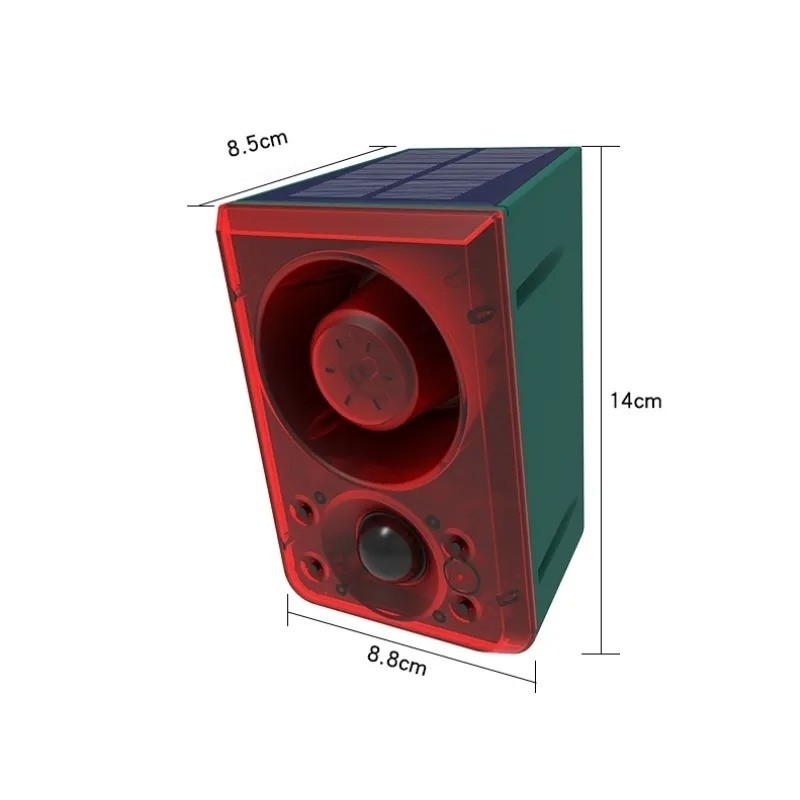Il repellente solare per animali è un dispositivo progettato per l'uso esterno, ad esempio in giardini o terreni. Combina un allarme sonoro, una luce lampeggiante e un sensore di movimento, che possono reagire al movimento nello spazio monitorato.