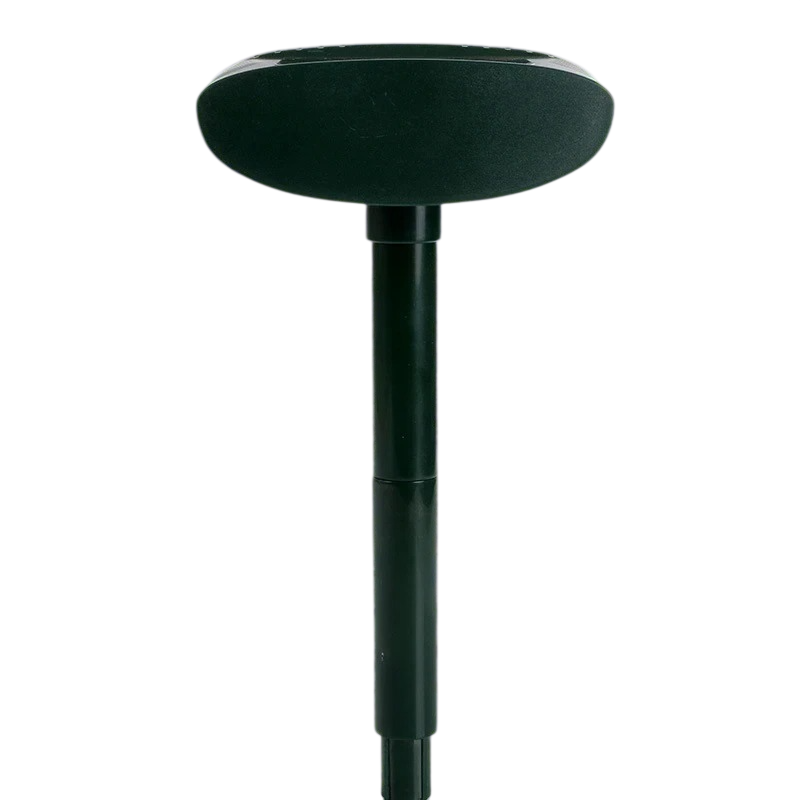 Le dimensioni del prodotto sono 37,5 x 15 cm, che includono la parte superiore del dispositivo e il palo di fissaggio progettato per essere inserito nel terreno. La finitura verde aiuta il dispositivo a integrarsi naturalmente nell'ambiente del giardino.