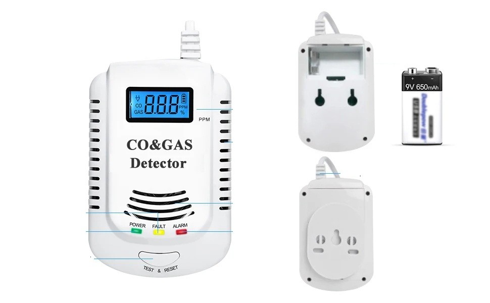 Rilevatore intelligente di CO e gas infiammabili (metano, propano, gas naturale) con display LED e allarme vocale >85 dB. Funzionamento a batteria (9V, non incluso), monitoraggio continuo. Descrizione completa