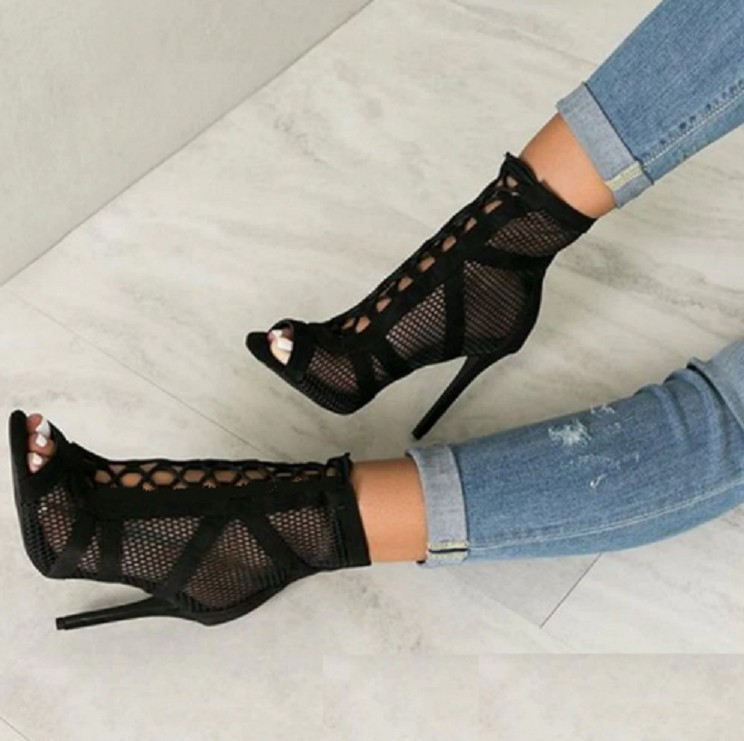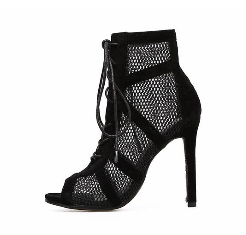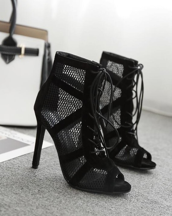 Questi sandali in pelle con lacci e rete ti piaceranno. I sandali sono alti fino alla caviglia.