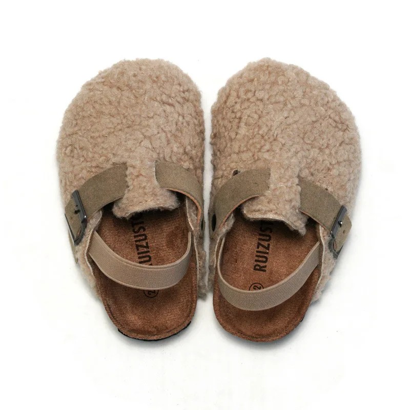 Morbidi sandali per bambini con cinturino elastico e suola in sughero. Pelliccia sintetica per comfort e calore. Calzature stilose per casa e all'aperto. Descrizione completa