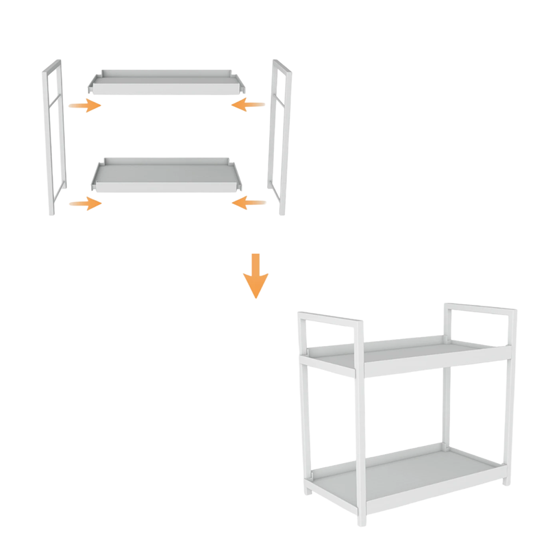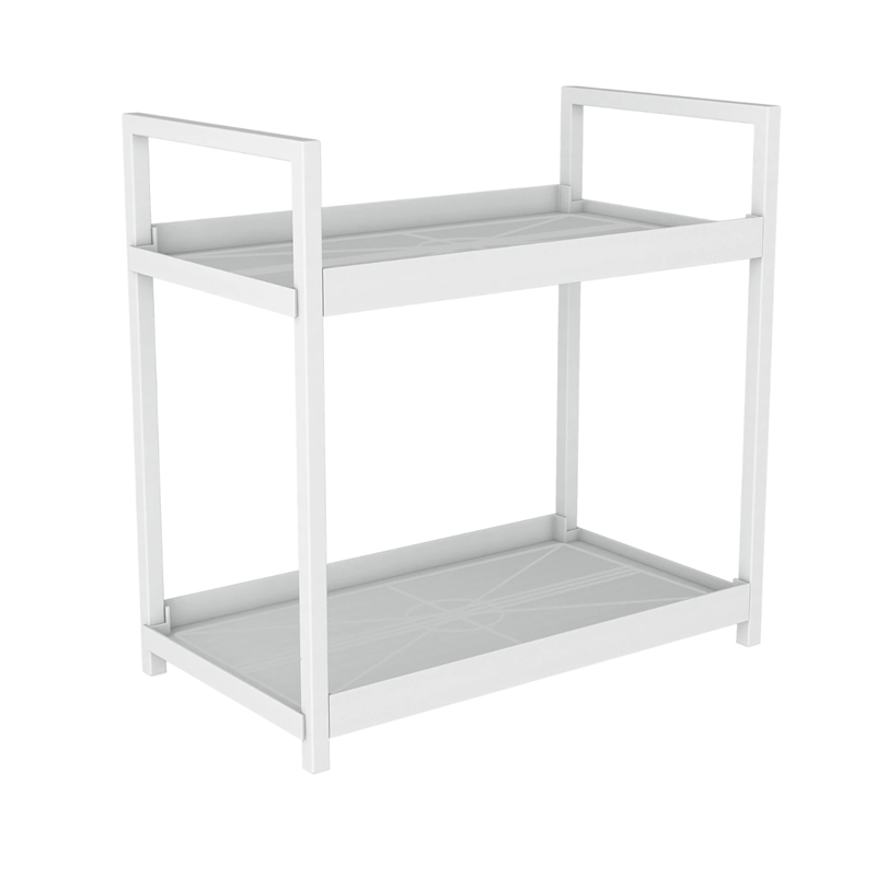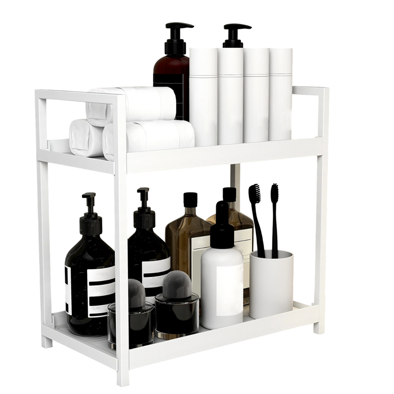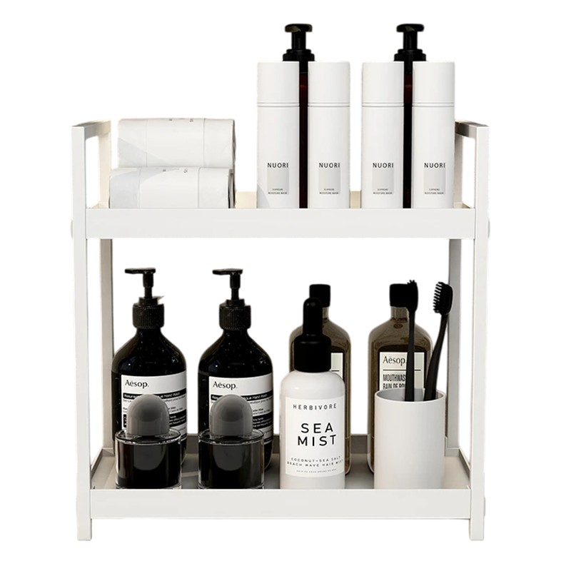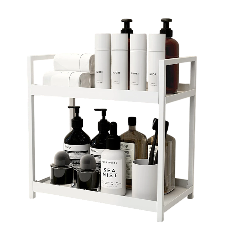Pratico organizzatore da bagno a due piani per un ordinato stoccaggio di cosmetici e accessori, con grande capacità e struttura stabile. Descrizione completa