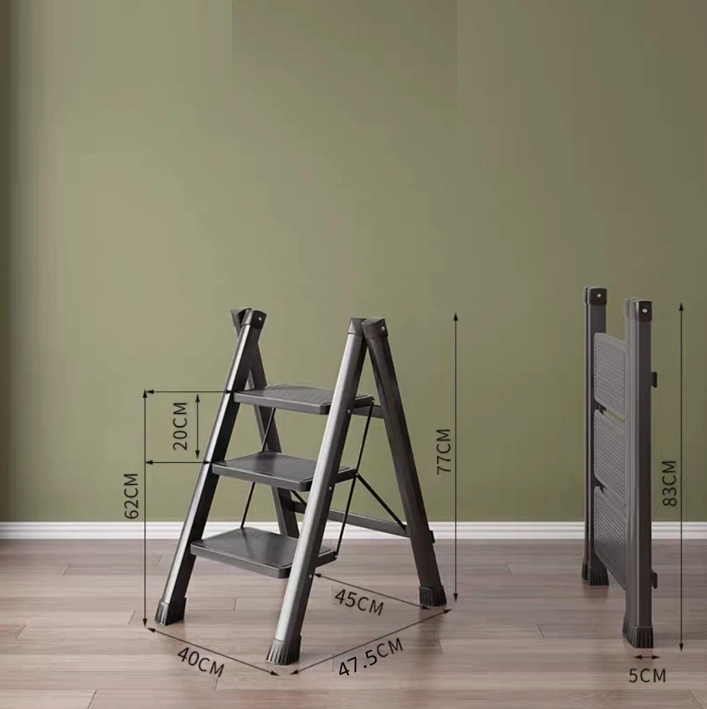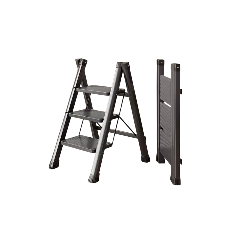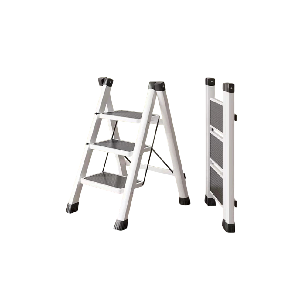 La parte inferiore è dotata di puntali antiscivolo, che impediscono lo scivolamento sul pavimento e proteggono la superficie da graffi. Grazie alla struttura pieghevole, le scale possono essere facilmente ripiegate e riposte in spazi ridotti, come in un armadio, in un ripostiglio o dietro una porta.