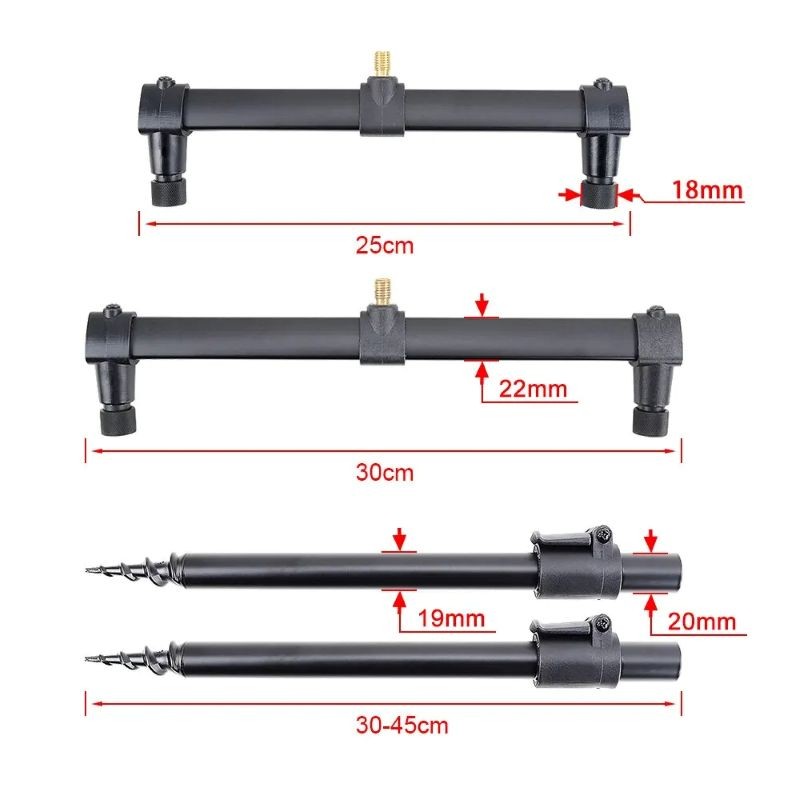 La confezione include due supporti di lunghezza 25 cm e 30 cm, che servono per il fissaggio di più canne. Due picchetti con lunghezza regolabile da 30 a 45 cm permettono di adattare l'altezza in base al terreno. Grazie a ciò, il supporto può essere utilizzato su diversi tipi di superficie. L'intero set è riposto in una borsa impermeabile, che protegge l'attrezzatura durante il trasporto e la conservazione.
