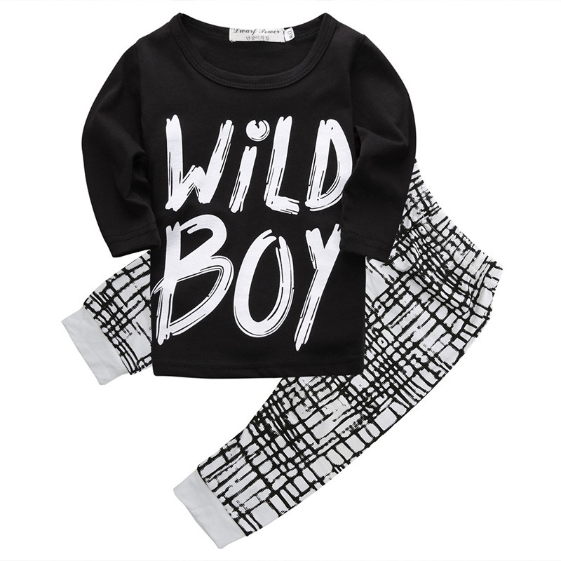 Il set include una felpa con la scritta WILD BOY in colore nero e pantaloni nero e bianchi.