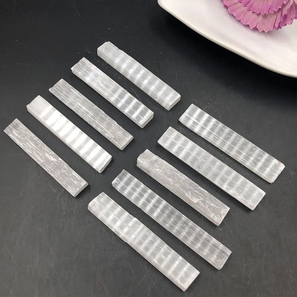 Set di 10 bastoncini di selenite naturali della lunghezza di 50–60 mm per lavorare con le energie, meditare, pulire i chakra e decorare lo spazio. Descrizione completa