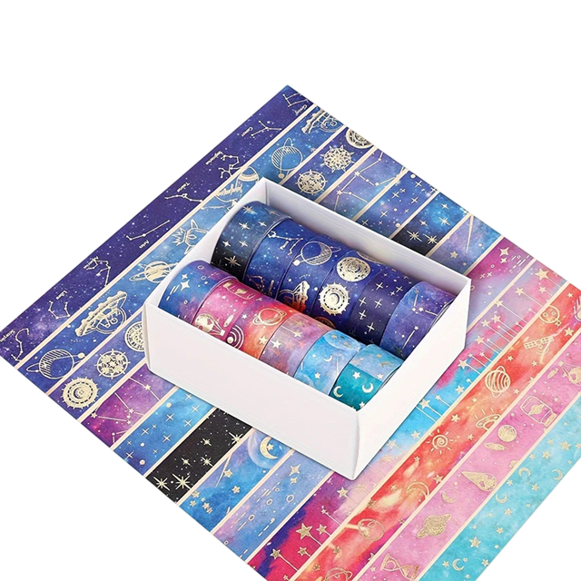 Questo set di 12 nastri adesivi decorativi è progettato per tutti coloro che vogliono dare ai propri progetti un'atmosfera originale e spaziale. Il motivo del cielo notturno polare arricchito da decorazioni dorate sotto forma di stelle, luna, pianeti e costellazioni crea un insieme visivamente distintivo ma allo stesso tempo elegante. Ogni nastro ha una dimensione di 1,5 cm x 2 m, il che lo rende adatto per dettagli piccoli e aree più grandi. Il set è ideale per la creazione creativa, la decorazione di auguri, l'imballaggio di regali e la personalizzazione di quaderni e planner. Grazie all'unità tematica dei singoli motivi, è possibile combinare facilmente più nastri in un unico progetto senza un'impressione di confusione.