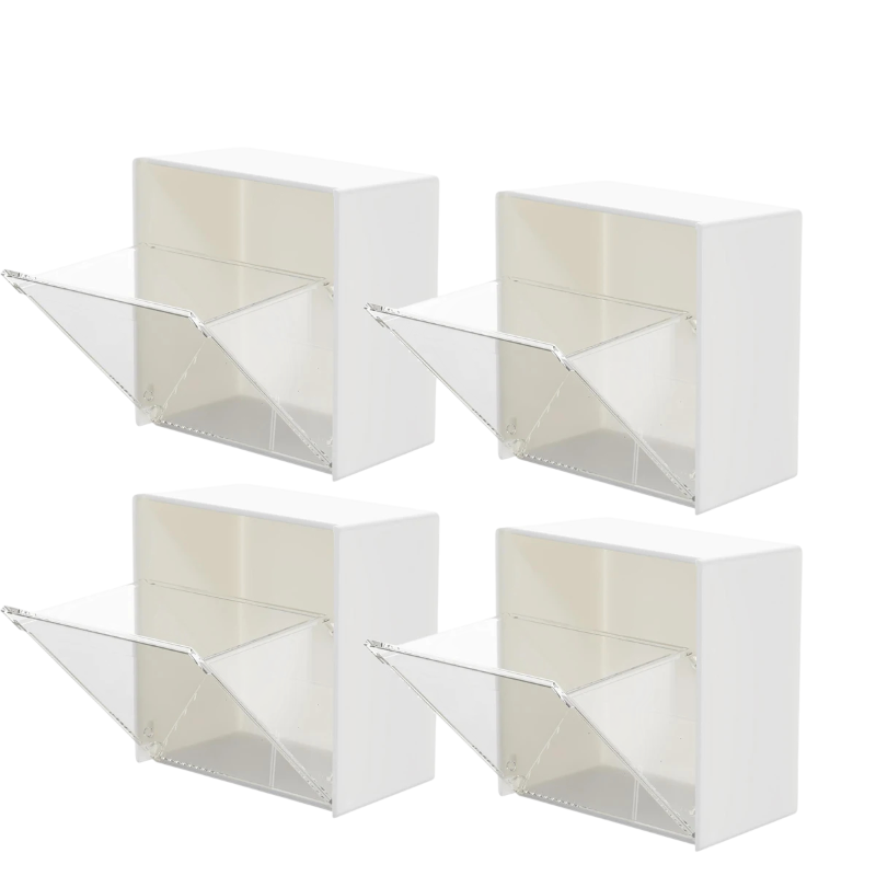 Pagina iniziale Pagina iniziale Casa e articoli domestici Soluzioni di archiviazione Scatole contenitore Set di 4 box da parete con coperchio a ribalta 8,5 x 8,5 x 4,5 cm organizzatore trasparente in plastica per cosmetici