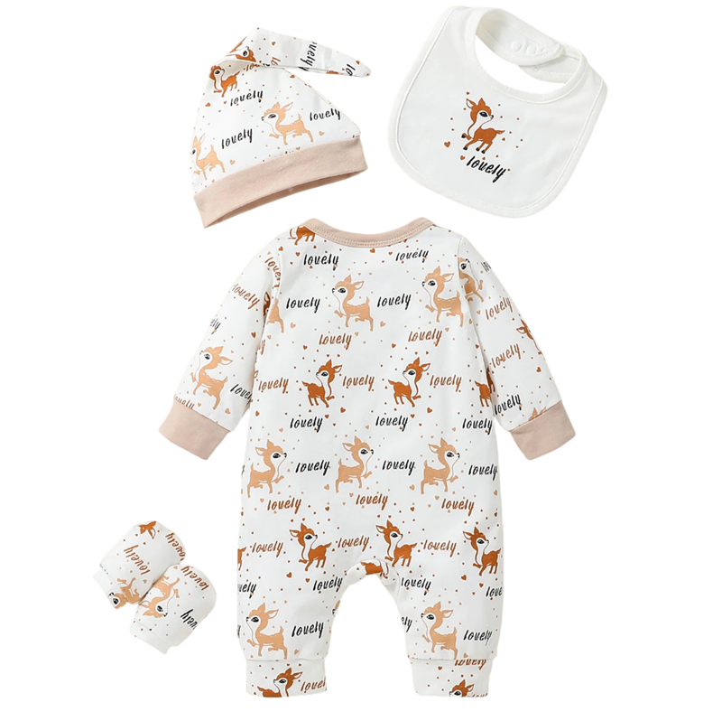 Set completo di 4 pezzi per neonati con tuta, cappello, bavaglino e guanti. Materiale morbido, elastico e traspirante con stampa animale. Descrizione completa