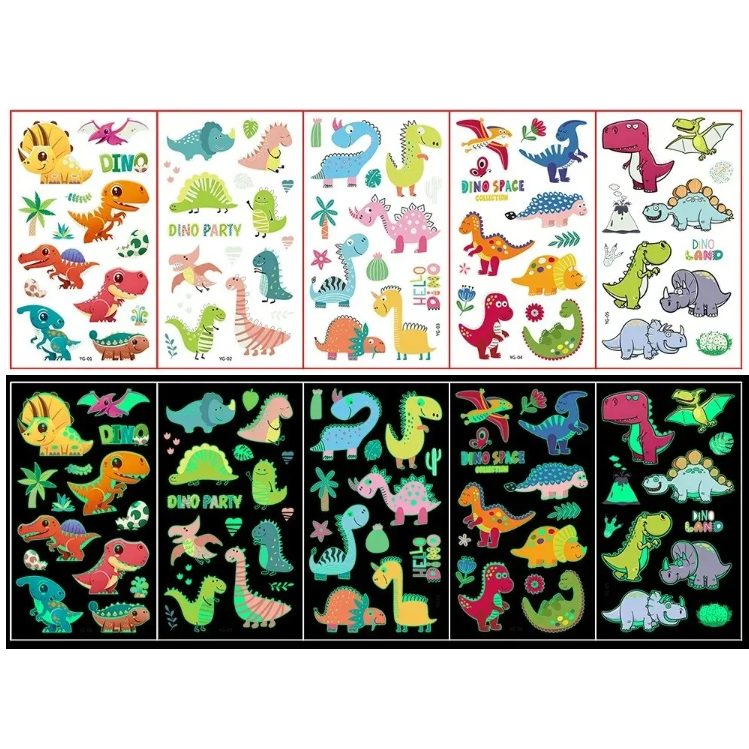 - Contenuto della confezione: 1x set (5 fogli di tatuaggi fluorescenti a tema dinosauro).