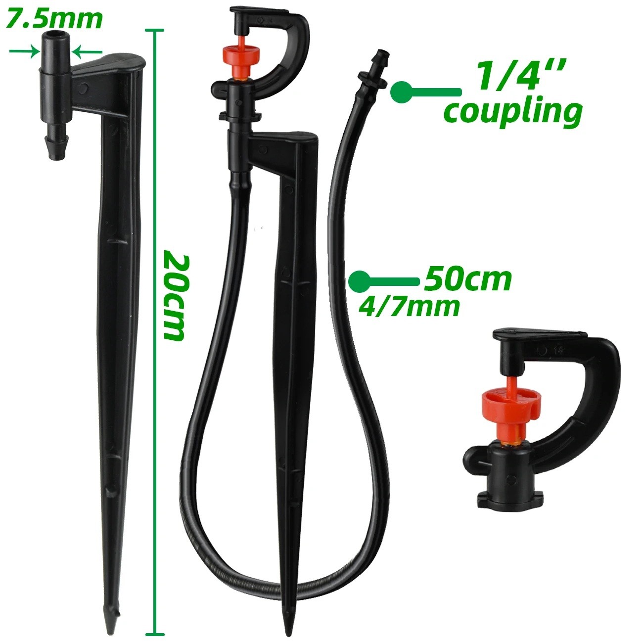Set di 5 irrigatori da giardino 360° con tubo da 50 cm e attacco da 1/4" per irrigazione a goccia con flusso regolabile