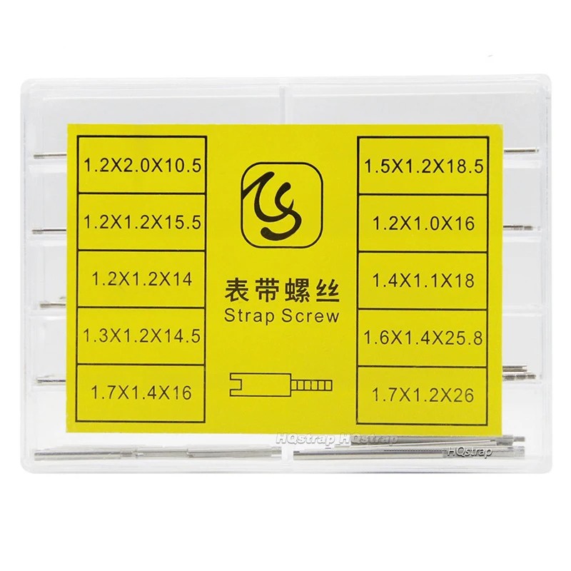 Set di 50 perni a vite per cinturini di orologi 10 dimensioni in scatola di plastica 8,6x6,4x1,6 cm