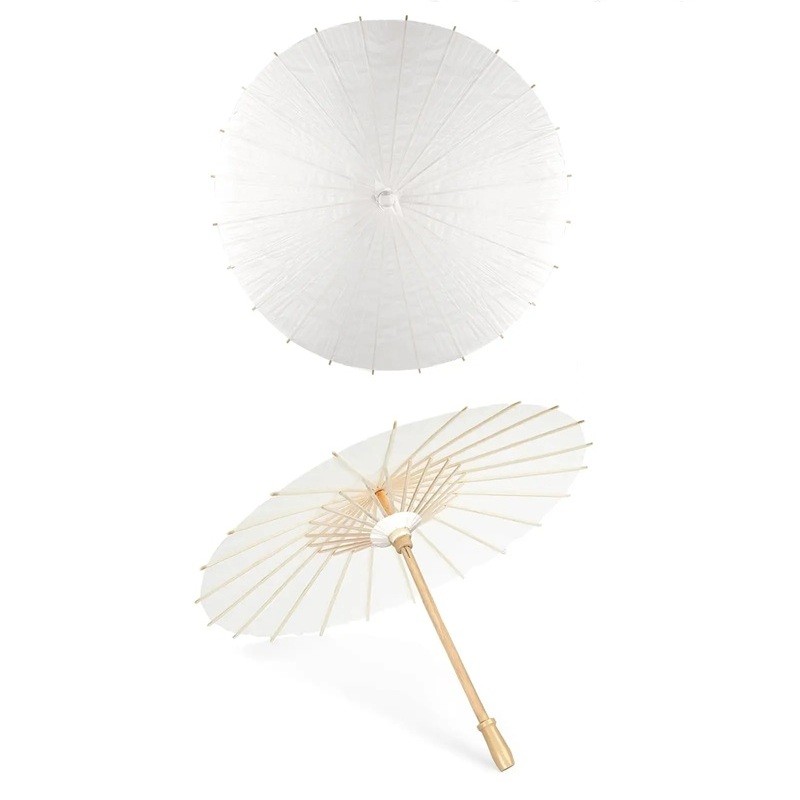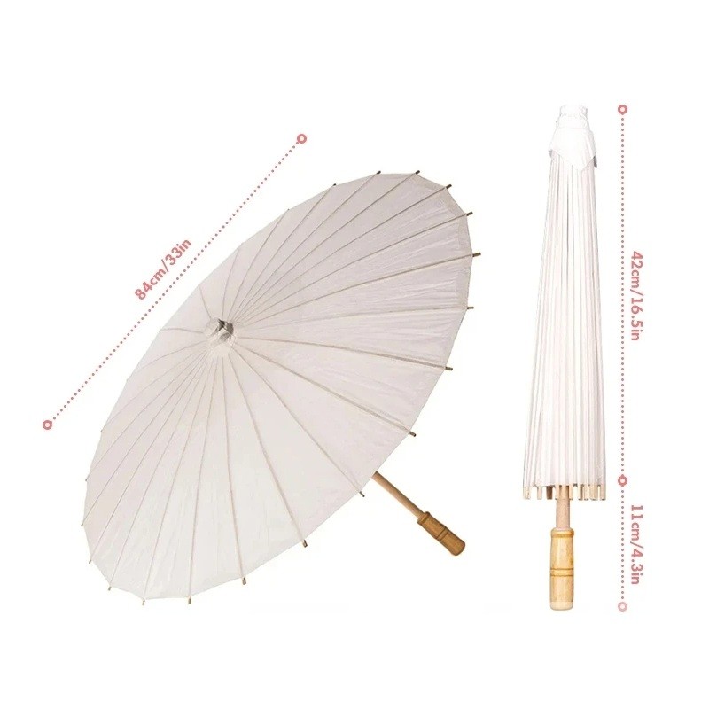 Grandi ombrelli di carta in stile cinese con diametro di 84 cm e manico in legno. Ideali come decorazione per matrimoni o accessorio per fotografie e feste. Descrizione completa