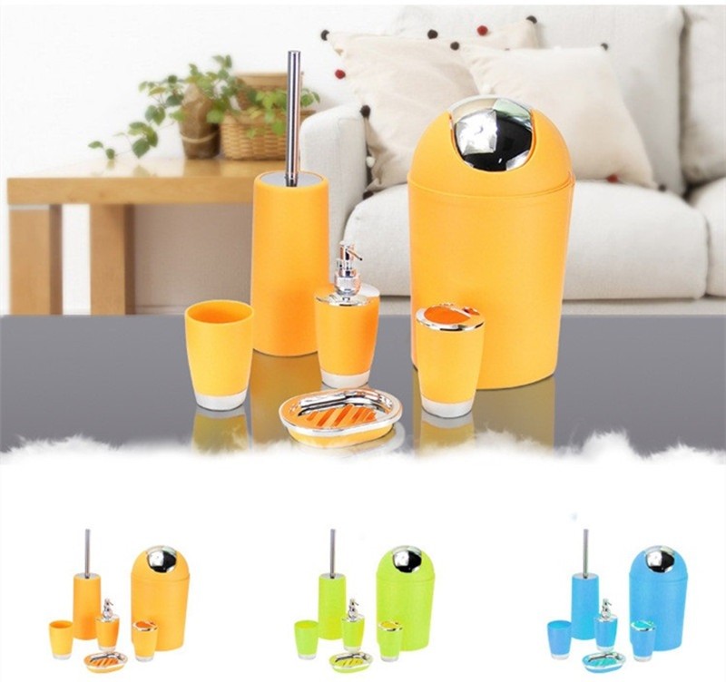Set con dispenser per sapone, bicchiere, porta spazzolini, piattino per sapone solido, scovolino per WC e cestino.