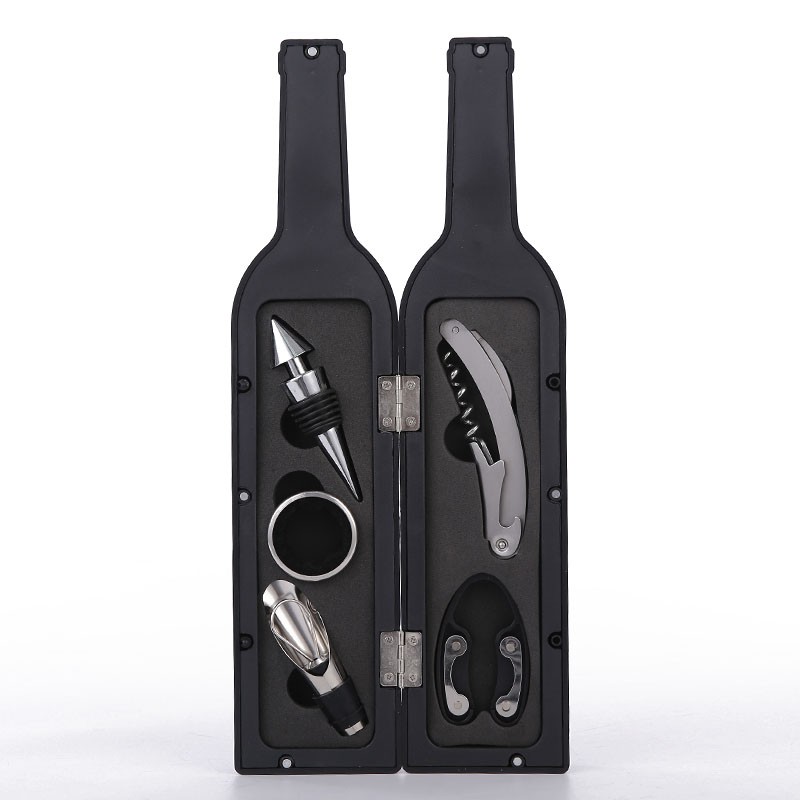 Contiene un anello per bottiglia, due apribottiglie, un tappo e un imbuto.