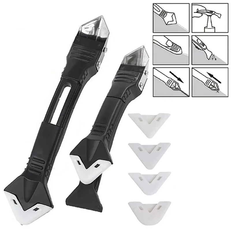 Pratica spatola 5 in 1 per rimuovere silicone, stucco e materiale per fughe, ideale per riparazioni, ristrutturazioni e lavori di finitura precisi. Descrizione completa