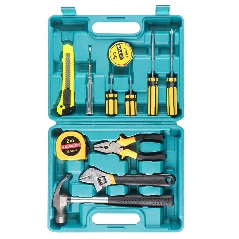 Set di attrezzi manuali universale 12 pezzi con custodia in plastica Martello Cacciaviti Pinze Chiave Metro Coltello Tester Attrezzatura pratica per la casa