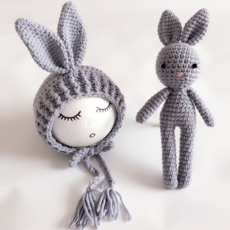 Roztomilý dětský set - pletená čepice s ušima a králík ve stejné barvě.