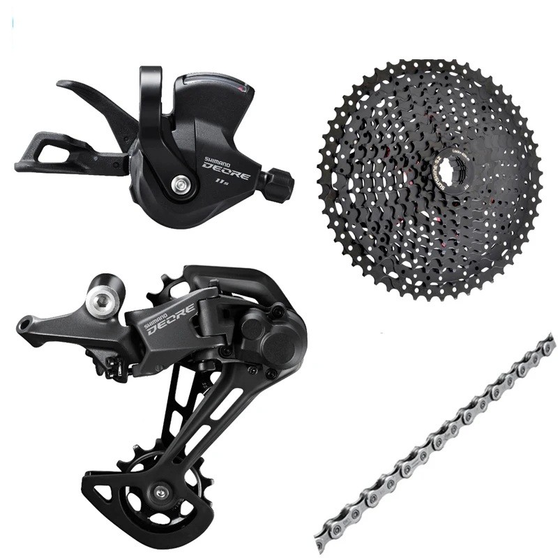 Questo set di cambio per bicicletta rappresenta una soluzione pratica per un sistema di trasmissione posteriore completo con 11 velocità. Include i componenti di base, visibili nell'immagine – leva del cambio, deragliatore posteriore, cassetta e catena. Ciò consente di assemblare o ripristinare facilmente un sistema di cambio funzionante senza dover acquistare i singoli pezzi separatamente. L'intervallo della cassetta 11–52T permette di adattare i rapporti a diverse condizioni, inclusa la guida in salita o in terreni più impegnativi. Il set è particolarmente adatto per mountain bike, dove è necessario un intervallo di rapporti più ampio.
