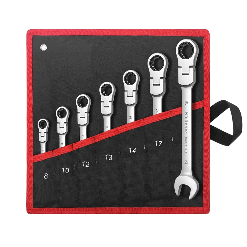 Set di 7 chiavi combinate a cricchetto con giunto, dimensioni 8 - 19 mm, in acciaio resistente, per utilizzo versatile. Descrizione completa