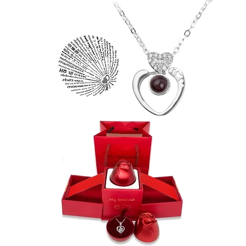 Set di collana proiettiva a forma di cuore con catena in titanio Proiezione Ti amo in 100 lingue Scatola regalo a forma di rosa