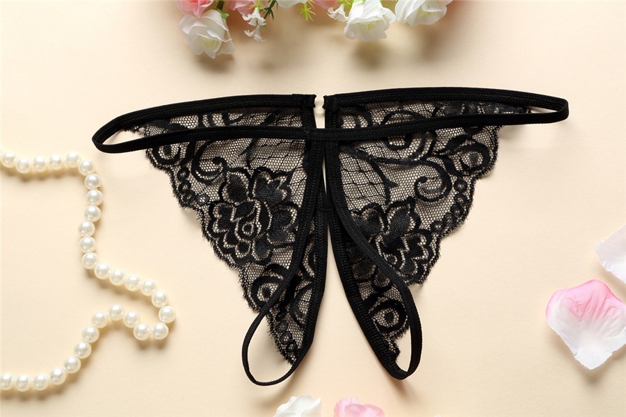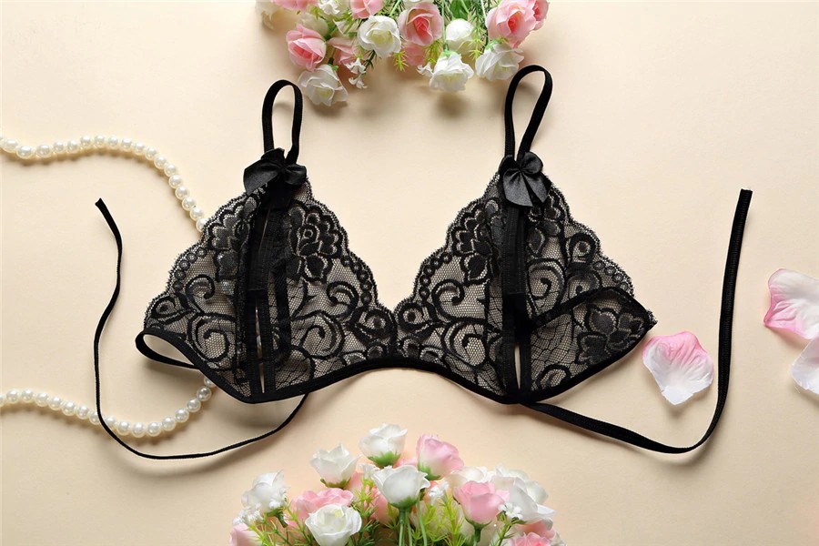 Lingerie erotica in pizzo, che comprende un reggiseno trasparente e un perizoma con aperture.