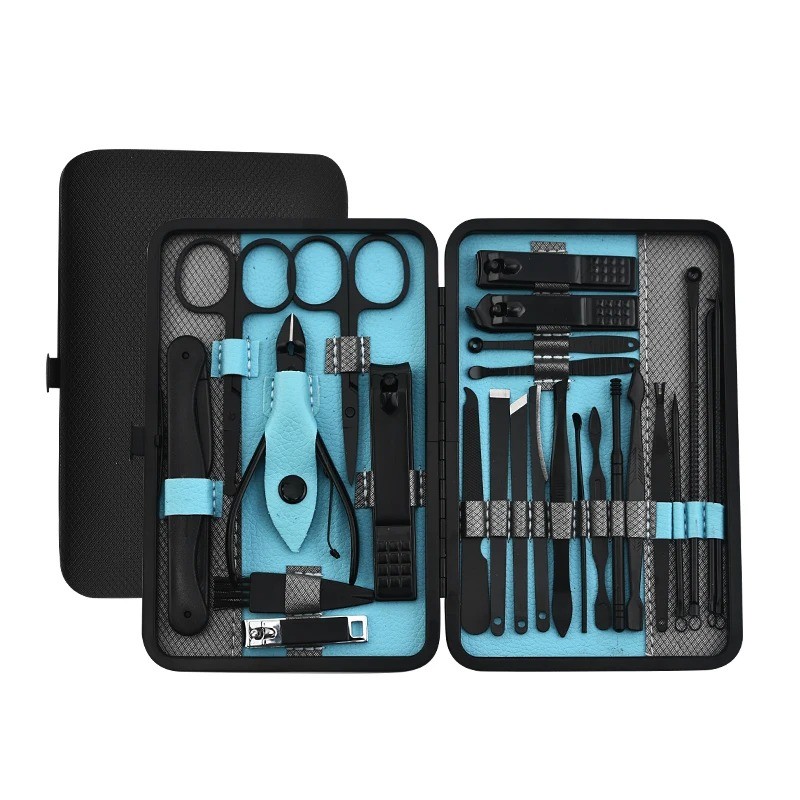 Questo set di manicure e pedicure da 25 pezzi in astuccio di pelle nera è progettato per una cura completa delle unghie dei piedi, delle mani e del viso. Include una vasta gamma di strumenti, tra cui forbicine, lima, forbici per unghie, pinzetta e cucchiaino per orecchie, tutti realizzati in acciaio inossidabile di alta qualità. Il set è progettato per soddisfare sia le esigenze professionali che quelle domestiche nella cura delle unghie ed è ideale per viaggiare grazie al suo pratico ed elegante astuccio in pelle.