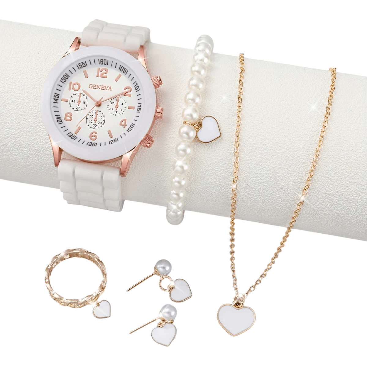 - Contenuto della confezione: Orologi bianchi da donna con cinturino in silicone, bracciale con perle e motivo cuore, orecchini con perle e motivo cuore, collana con cuore, anello con cuore