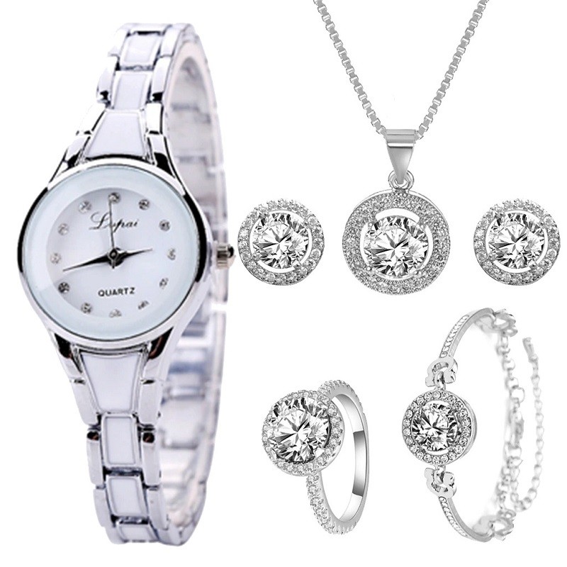 Questo splendido set include un orologio, una collana con pendente, un bracciale, un anello e orecchini per un look elegante. Tutti i pezzi sono realizzati con materiali di alta qualità. È la scelta ideale per qualsiasi occasione speciale o come regalo originale e unico per qualcuno di speciale.