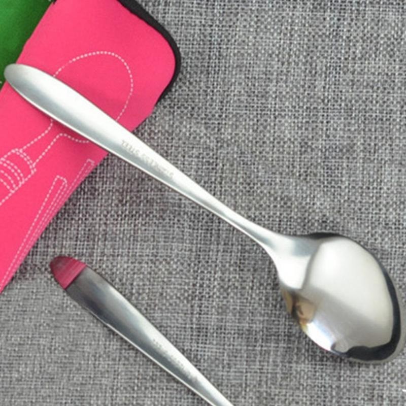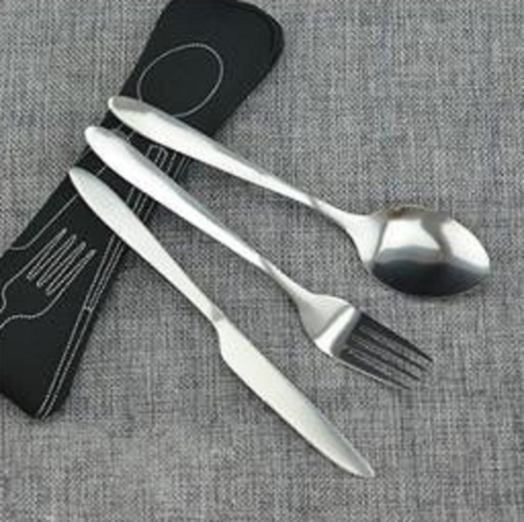 Il set di posate in acciaio inossidabile è composto da una forchetta, un coltello e un cucchiaio. Le posate sono riposte in un astuccio colorato con zip.
