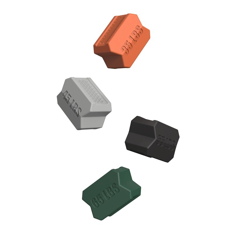 • Set da 8 potenziatori in silicone – 2 pezzi per ogni resistenza (35 lbs ≈ 16 kg, 45 lbs ≈ 20 kg, 55 lbs ≈ 25 kg, 65 lbs ≈ 29 kg)