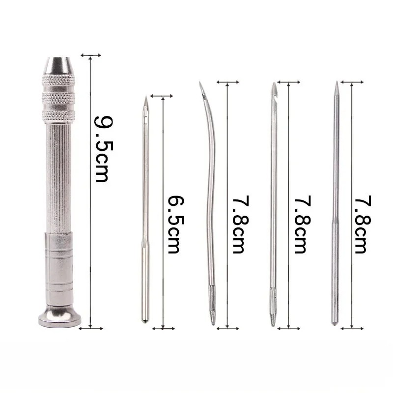 Questo set universale di punte per pelle include un manico in metallo resistente e cinque aghi intercambiabili in acciaio inossidabile. È ideale per riparazioni manuali di scarpe, pelle, borse, tappezzeria o altri materiali più spessi.