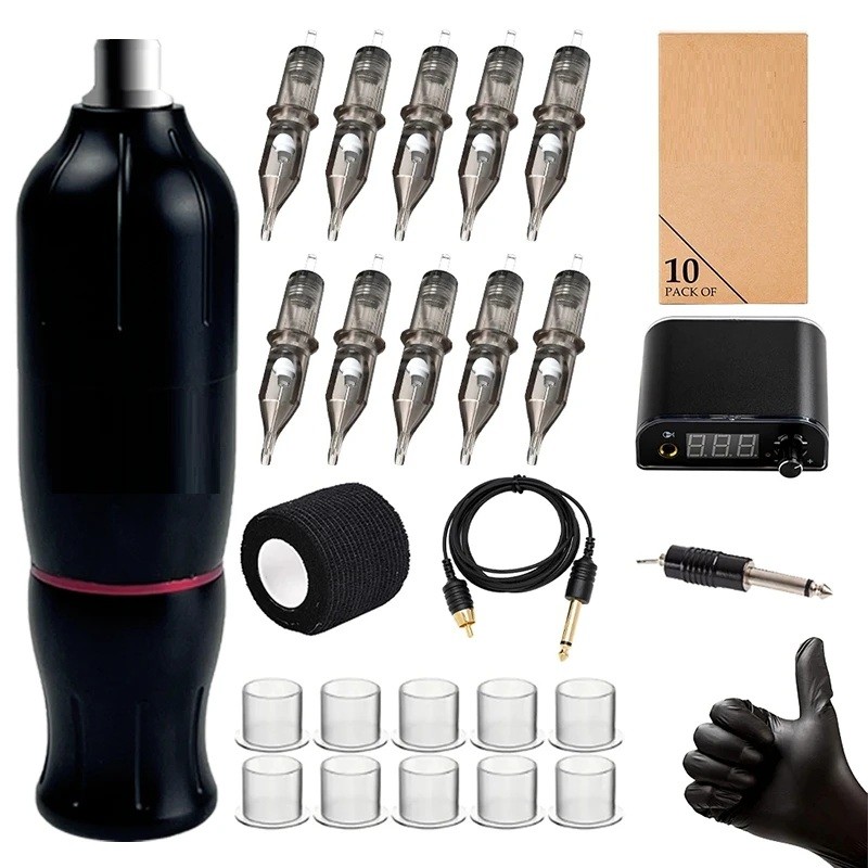 Il set include un set di aghi per tatuaggi che consente di adattare il processo di tatuaggio a diversi stili e tecniche. Inoltre, il set comprende bicchierini per colore, grip per la macchinetta, pedale per un controllo comodo e guanti monouso per un tatuaggio sicuro e igienico.