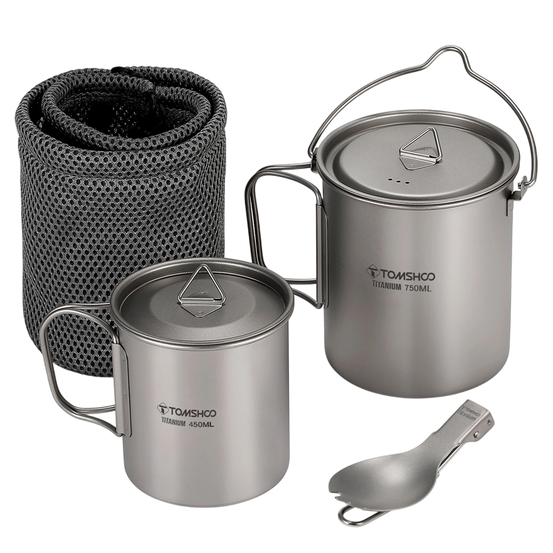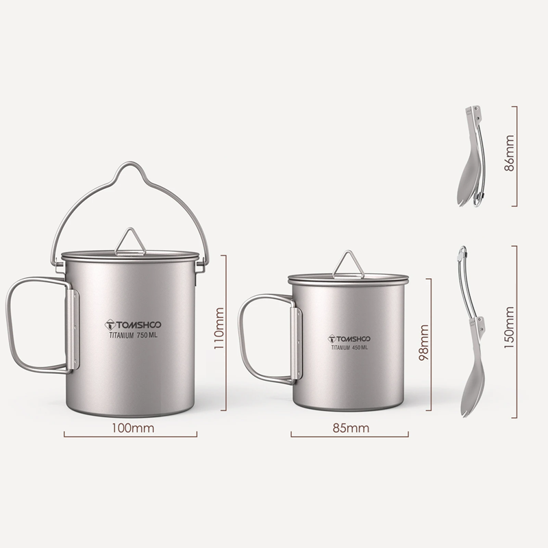 Set di tazze in titanio da 750 ml e 450 ml con coperchio Manici pieghevoli Utensili da campeggio ultraleggeri Spork e borsa da trasporto per escursioni