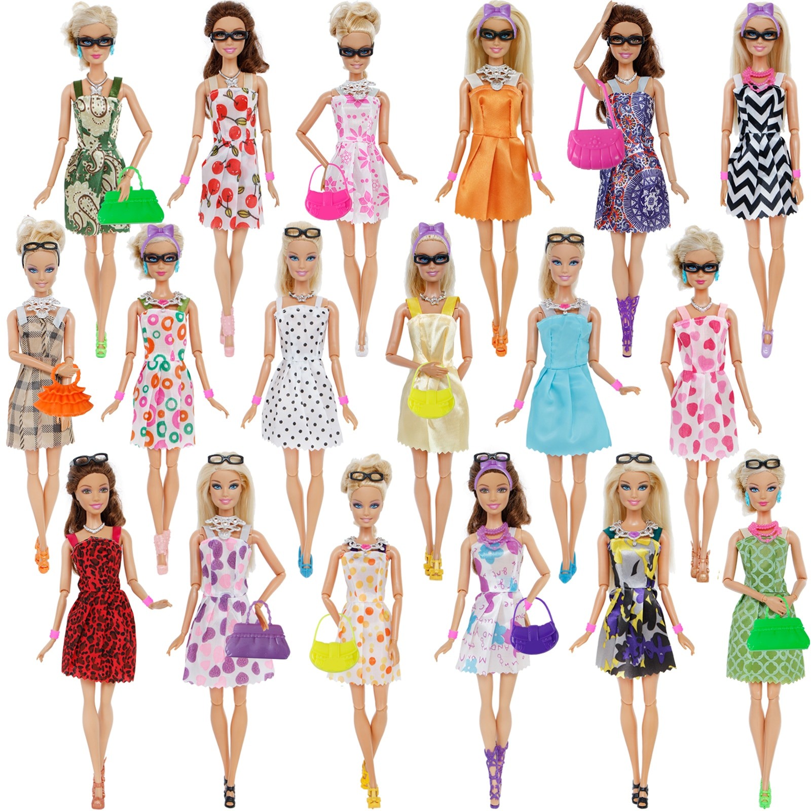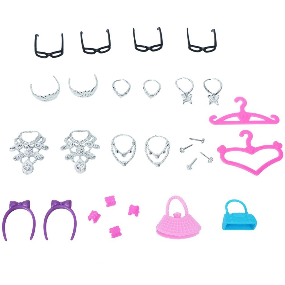 La confezione include 10x scarpe, 8x vestiti, 8x collane, 4x occhiali, 2x corone, 2x bracciali, 2x orecchini, 2x cerchietti, 2x grucce, 2x borse.