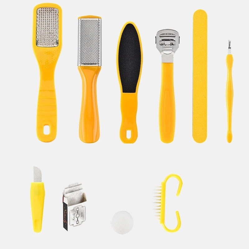 Contiene lime abrasive, pomice, strumenti per la cura delle unghie e della pelle indurita e spazzolino.