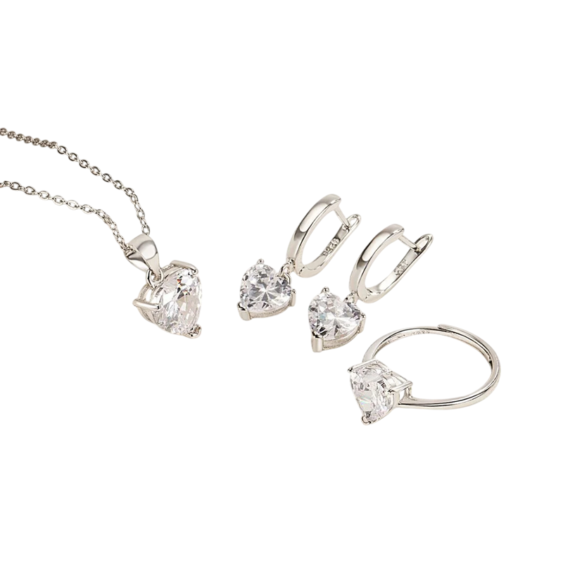 Questo set romantico rappresenta un bellissimo connubio di eleganza e simbolismo dell'amore. Il design uniforme dei tre gioielli crea un'impressione equilibrata e lussuosa. Grazie al materiale di alta qualità, i gioielli manterranno la loro lucentezza anche con un uso regolare. Se stai cercando un regalo significativo ed elegante che possa sorprendere e lasciare un'impressione duratura, questo set è un'ottima scelta.
