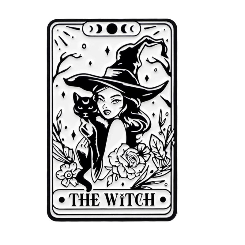 La spilla con motivo di strega e gatto è realizzata in uno stile illustrativo che ricorda una carta con una cornice decorativa. Al centro del motivo c'è una figura con un cappello accompagnata da un gatto nero, creando un insieme audace e tematico. Il design è arricchito da dettagli sottili, come fiori e simboli, che completano l'aspetto generale. La realizzazione in bianco e nero garantisce contrasto e buona leggibilità degli elementi. Grazie alle sue dimensioni compatte, la spilla è adatta per un uso quotidiano.