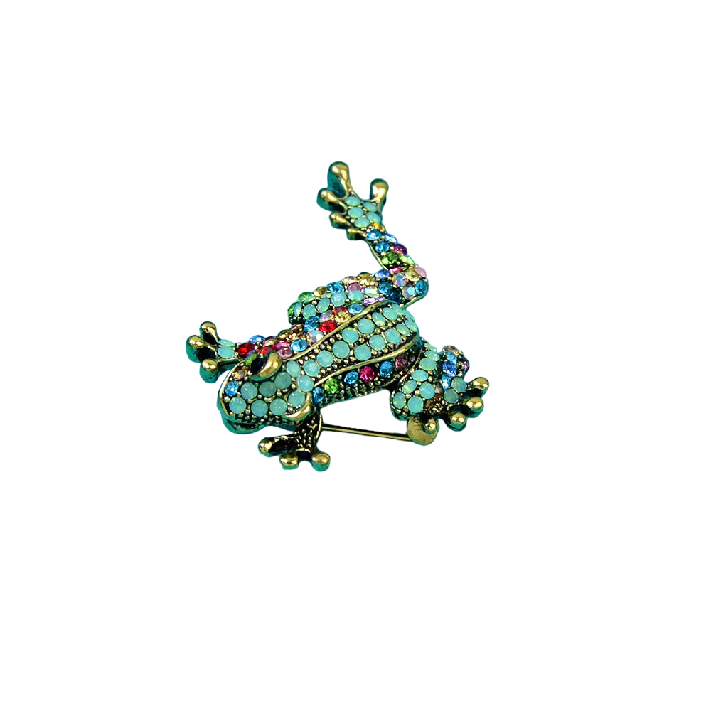 Spilla decorativa a forma di rana. La rana è decorata con pietre, dalle quali si riflette splendidamente la luce e brilla. La spilla è realizzata con materiali di alta qualità. Questa spilla sarà una bellissima decorazione per il vostro abbigliamento!