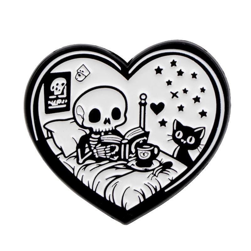 Questa spilla colpisce per il suo vivace design bianco e nero e il motivo a forma di cuore. All'interno del motivo è rappresentata la figura di uno scheletro sdraiato a letto, accanto a cui si trova un gatto nero. L'intera scena è arricchita da piccoli dettagli, come stelle, cuori e altri simboli che completano l'aspetto generale.
