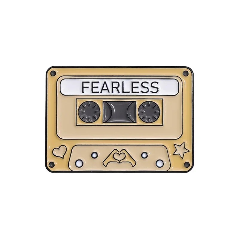 Spilla smaltata a forma di cassetta musicale FEARLESS circa 2,8 × 2 cm spilla metallica beige retro distintivo per giacca zaino borsa abbigliamento